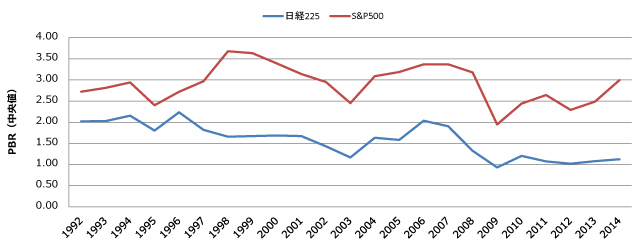 日本の日経平均株価225(東京証券取引所第一部に上場する銘柄の株式のうち225銘柄を対象)および米国の主要株価指数の一つであるS&P500(スタンダード・アンド・プアーズ社が算出しているニューヨーク証券取引所、NYSE MKT、NASDAQに上場している銘柄から代表的な500銘柄を対象)について、過去25年間における推移を見ても日本企業のROEは米国に比して低く推移している事が分かる。